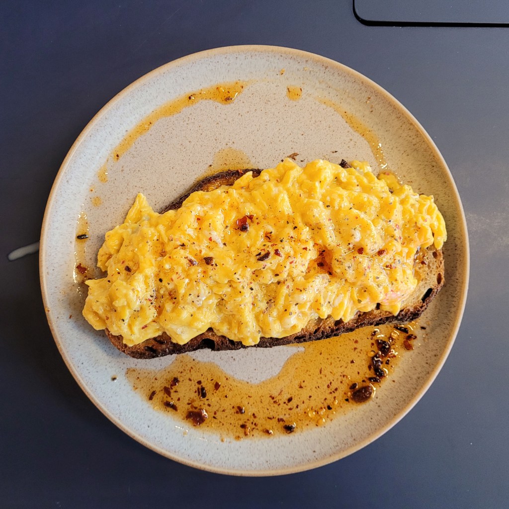 Brew is one of my go to coffee shops. It’s off the lobby of the Hyatt Hotel in Eddington, strangely the hotel also has its own restaurant serving breakfasts on the other side of the lobby, but it’s independently owned by Ely Coffee Roasters. It serves excellent coffee and limited breakfast/brunch options. I think that’s why it’s good, it doesn’t do much but what it does it does exceptionally well. My choice is scrambled eggs with chilli oil, cooked just right and just enough to set me up for the day. What a treat!